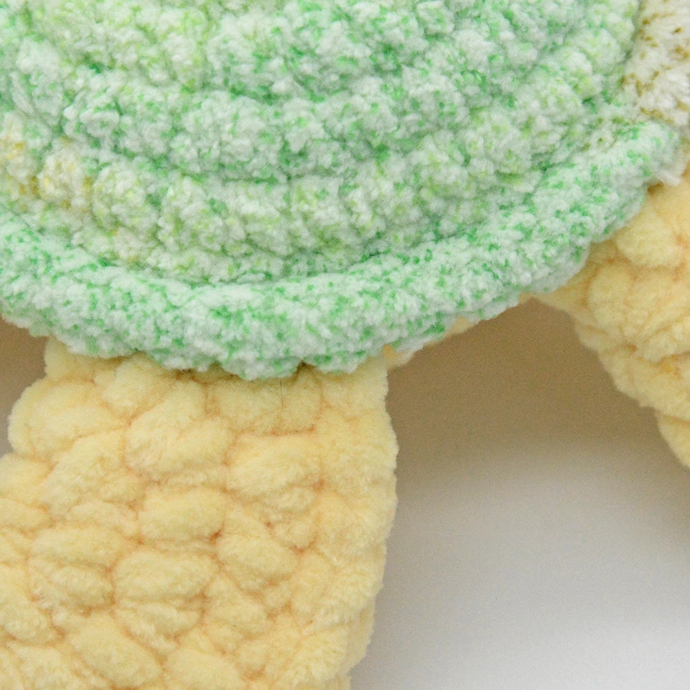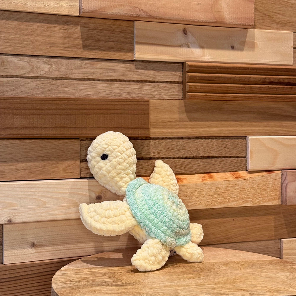 Small Shelly est une petite tortue unique, entièrement faite à la main. Chaque partie, des nageoires à la carapace, est crochetée avec soin, puis assemblée et cousue une à une. Les yeux sont brodés avec délicatesse, lui conférant son expression douce et rassurante.